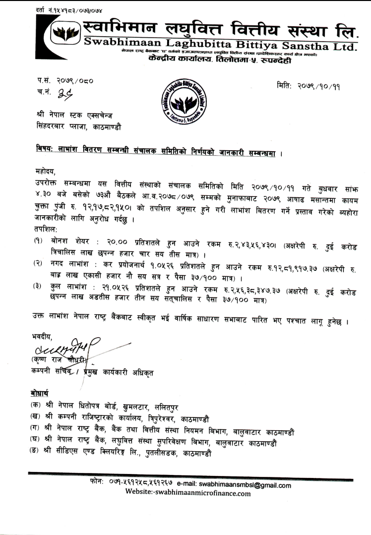 स्वाभिमान लघुवित्तकाे लाभांश घोषणा